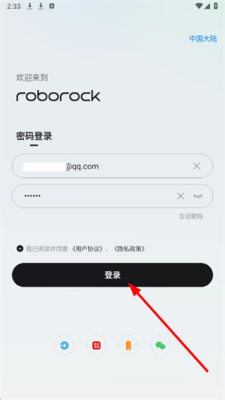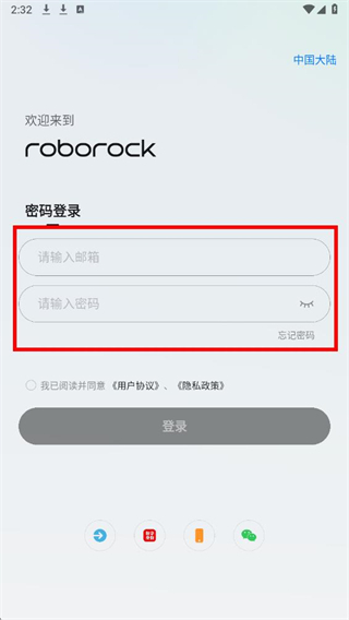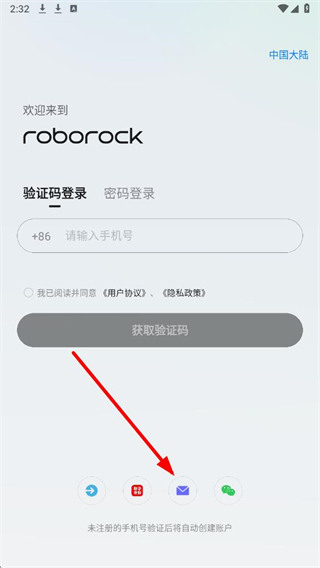 1、打开roborockAPP,在登录页找到邮箱对应图标并点击,切换至邮箱登录模式。
