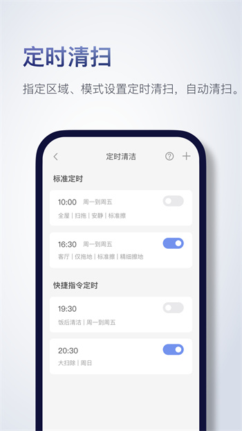 预约定时清扫任务,机器人将在指定开始清扫任务,完成后将自动返回充电座。