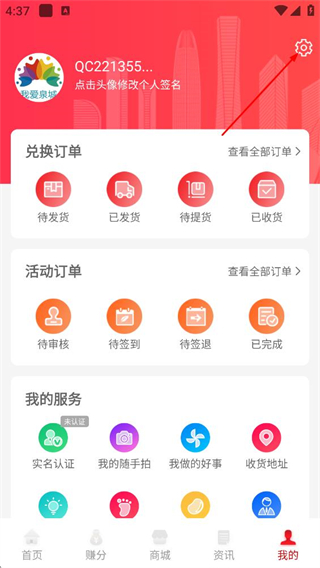 2、在个人的页面,点击右上角的设置图标,进入设置页面。