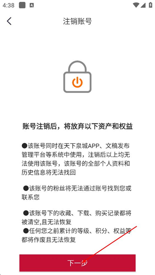 5、在注销账号说明页面,点击下一步按钮,进入重要提醒页面。