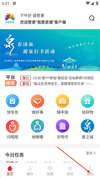 1、在我爱泉城首页,点击底部的我的选项,进入个人页面。