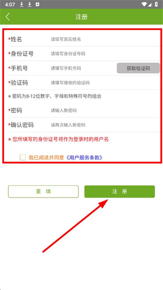 4、在页面填写姓名、身份证号等必填信息,勾选协议后点击注册完成账号注册。