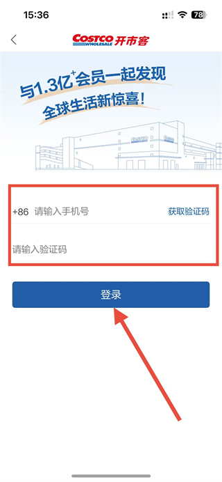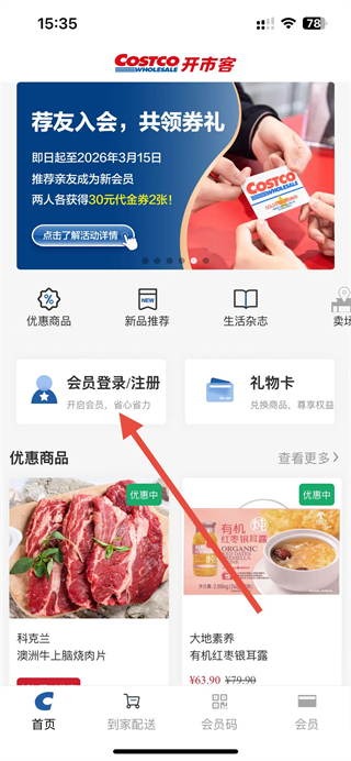 1、进入开市客APP,在首页找到会员登录注册选项并点击,进入登录相关页面。