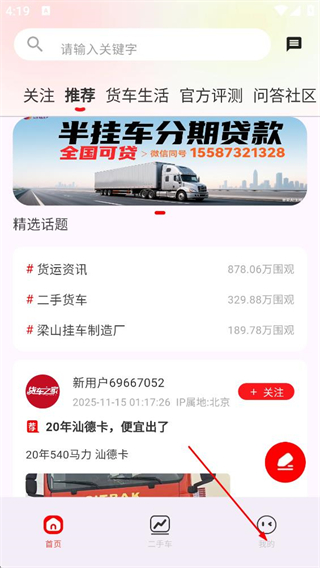1、在货车之家首页,点击底部的我的选项,进入个人页面。
