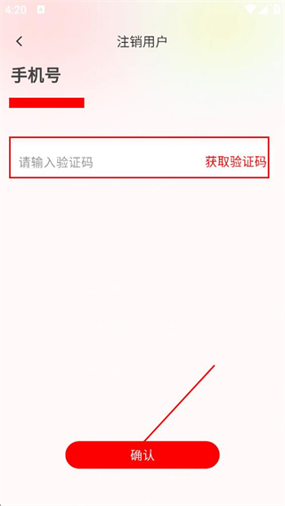 4、在注销用户页面,点击获取验证码,填写对应的验证码后,点击确认完成注销操作。