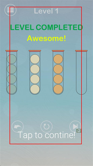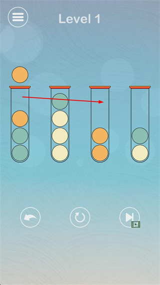 3、在第1关界面中,将装有混合颜色小球的试管里的小球,按颜色分类移动到对应试管中。