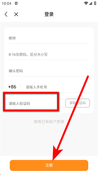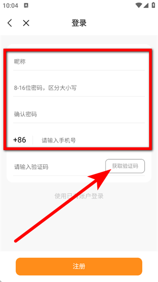 4、输入昵称、设置密码,输入手机号,点击获取验证码。