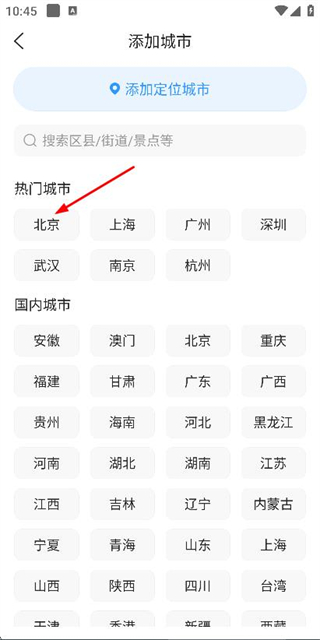 3、在添加城市页面点击热门城市中的北京选项,完成该城市天气的添加。
