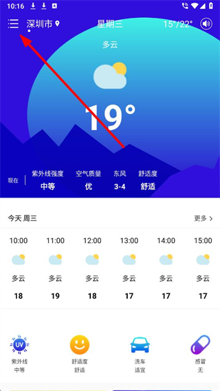 1、在雨时天气app首页,找到左上角的菜单图标并点击,进入设置页面。