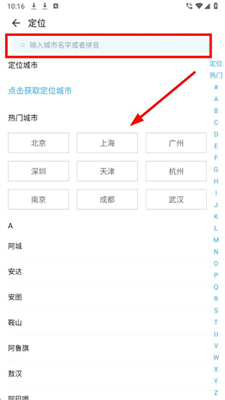4、在定位页面,可通过搜索框输入城市名,或选择热门城市列表中的城市,完成城市信息的添加。