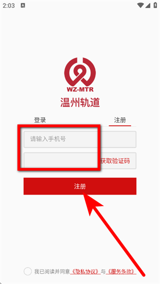 4、在注册页面,输入手机号和验证码,点击注册,完成账号注册。