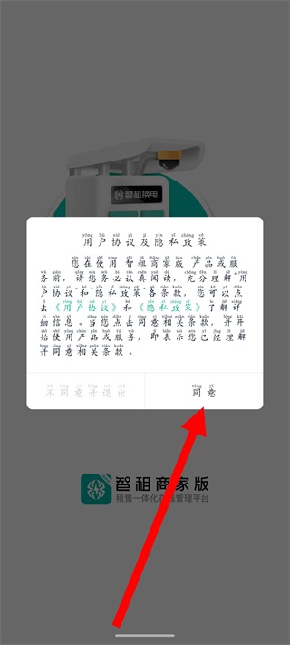 1、打开智租商家版,在用户协议及隐私政策提示框,点击同意。