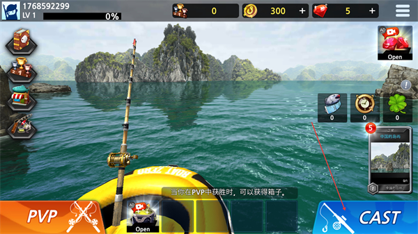 1、在初始界面,点击CAST抛出鱼钩,开启钓鱼流程,准备垂钓。
