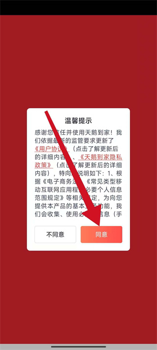 1、打开天鹅到家后,弹出弹窗,点击同意,进入首页。