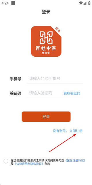 1、在百姓中医登录页面点击立即注册选项,进入注册信息填写页面。