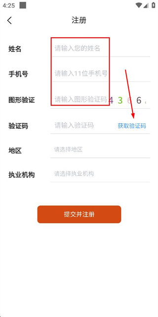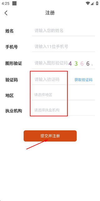 3、在注册页面填写验证码、选择地区与执业机构后,点击提交并注册按钮完成注册。
