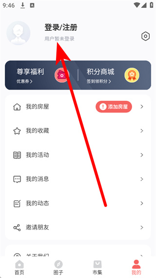 2、在个人中心页面点击登录注册区域,进入短信验证登录注册页面。