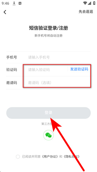 4、将收到的短信验证码填入验证码栏,勾选相关协议后,点击登录完成账号登录。