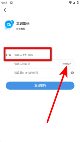 3、在忘记密码页面,输入手机号码,点击获取验证码。
