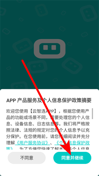 1、打开云智连,在个人信息保护政策摘要弹窗,点击同意并继续。