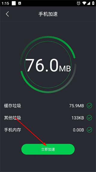3、点击立即加速按钮,即可清理缓存垃圾、释放手机内存。