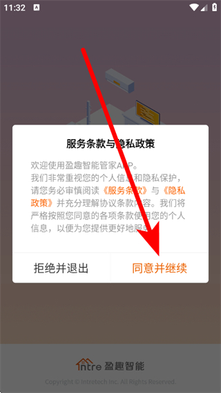 1、打开盈趣智能管家,在服务条款与隐私政策弹窗中,点击同意并继续。