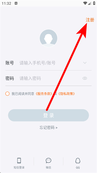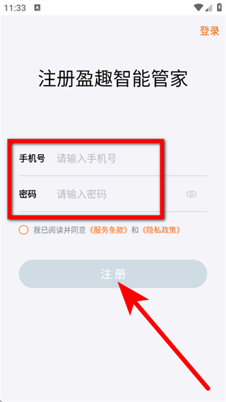 2、在登录页面,点击右上角的注册选项,进入注册盈趣智能管家页面。
