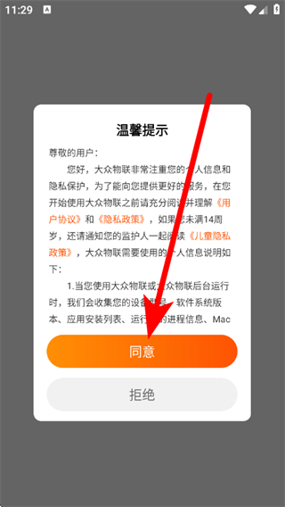 1、打开大众物联,在温馨提示弹窗,点击同意。