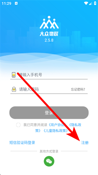 2、在大众物联登录页面,点击注册,进入注册界面。