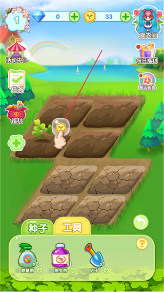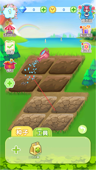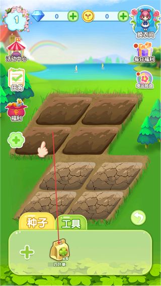1、在花园界面,选择四叶草种子种植到土地中,开启种植流程。