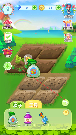 3、植物发芽后,使用除草剂工具维护植物,推进生长进度。