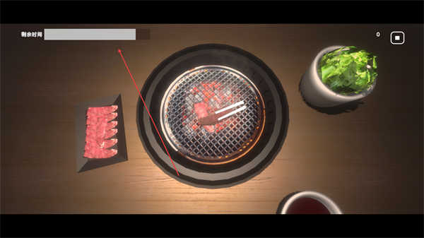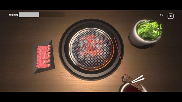 1、在烤肉场景中,用筷子夹取左侧的生肉,准备进行烤制。