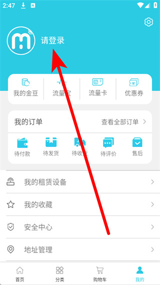 2、在个人中心页面点击请登录区域,进入账号登录页面。