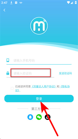 4、将收到的短信验证码填入请输入验证码栏,勾选协议后,点击登录完成账号登录。