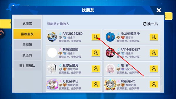 4、在推荐列表中,点击目标玩家右侧的+,即可发送好友申请完成添加。