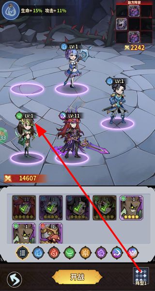 2、将获得的角色布置到阵容空位中,搭配其他角色组成队伍,选择对应的阵型后点击开战,即可进入战斗环节。