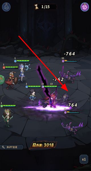 3、进入战斗后角色会自动释放技能,技能释放时会产生特效并造成伤害,会显示实时伤害数值,累计总伤害推进战斗。