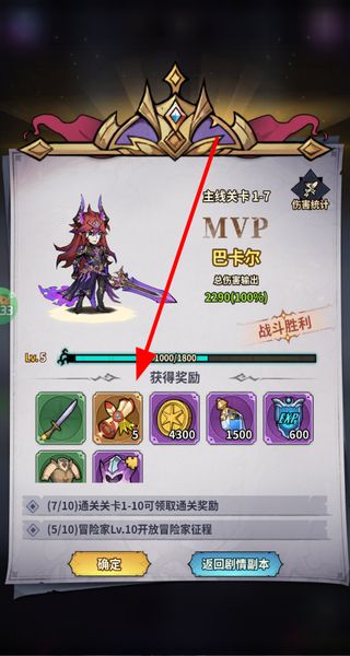 4、战斗胜利后会显示MVP角色与获得的奖励,奖励包含装备与资源等,点击确定即可领取奖励,继续后续的游戏进程。