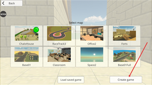 2、进入地图选择界面后,可挑选ChaloHouse、RaceTrack3等不同场景地图,选定目标地图后点击Create-game按钮,即可创建对局并进入对应射击战场。
