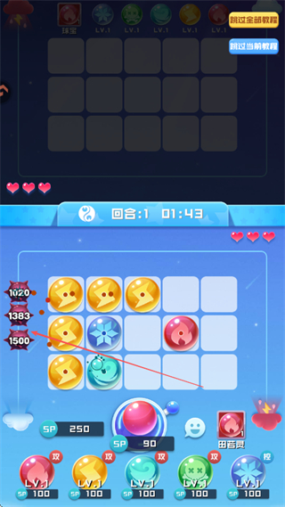 2、将同类型球球放在相邻格子,方便合成升级提升属性;合成优先选择攻击类球球,快速强化输出能力,像教程中相邻放置雪花球球触发合成。