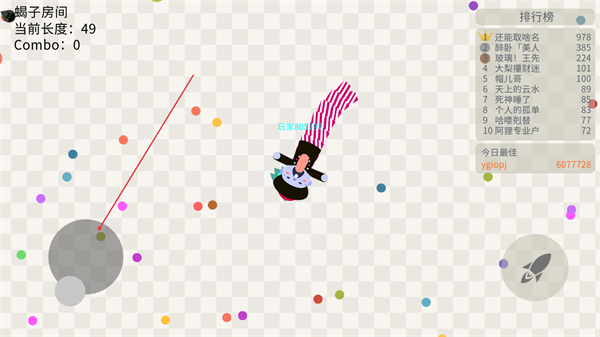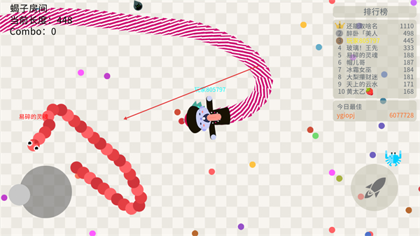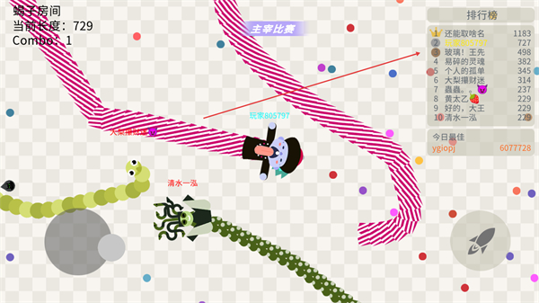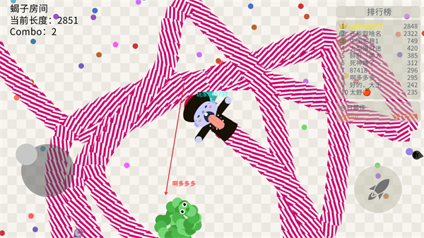 3、在全场比赛模式中,躲避其他玩家的蛇身,同时寻找机会收集更多圆点,提升Combo数。