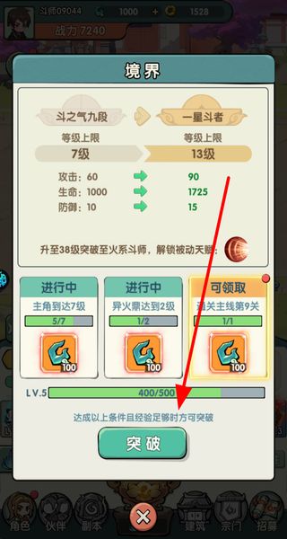 4、达成境界突破的条件后,点击突破提升境界,境界提升会解锁更高等级上限,同时增强自身属性。