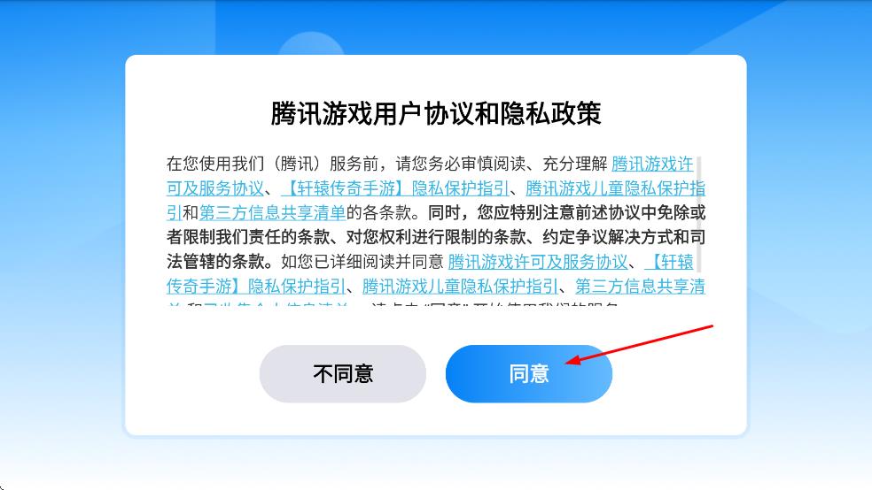 1、打开游戏后,查看弹出的腾讯游戏用户协议和隐私政策,点击界面中的“同意”按钮,进入后续流程。