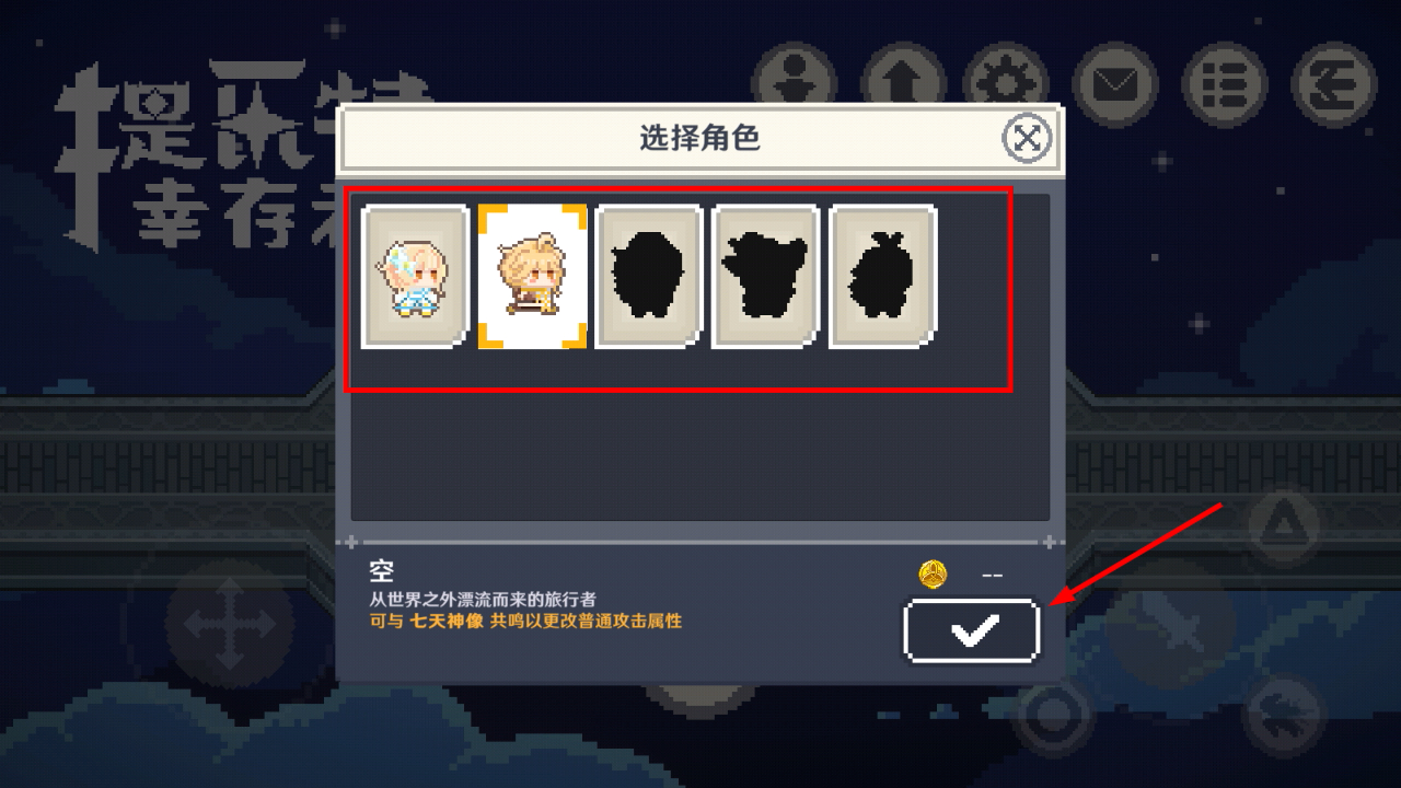 1、进入游戏先打开角色选择界面,挑选可用角色如【空】,确认选择后开启冒险,为后续闯关奠定战力基础。