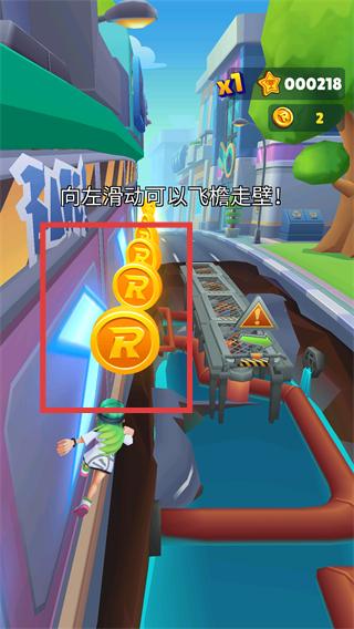 2、根据提示【向左滑动可以飞檐走壁!】,向左滑动操控角色贴墙移动,同时收集【R】道具,积分更新为【000218】。