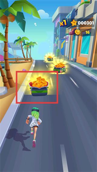 3、遇到【金币桶】道具时,操控角色靠近拾取,获得大量金币,此时积分升至【000301】。
