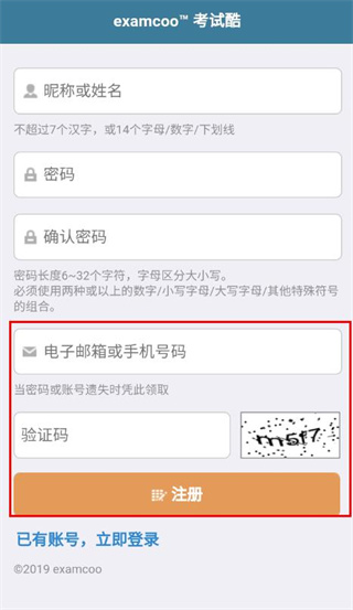 1、打开考试酷的登录页面,点击免费注册选项,进入注册界面。