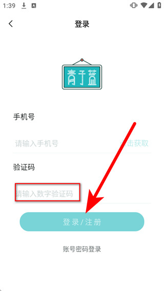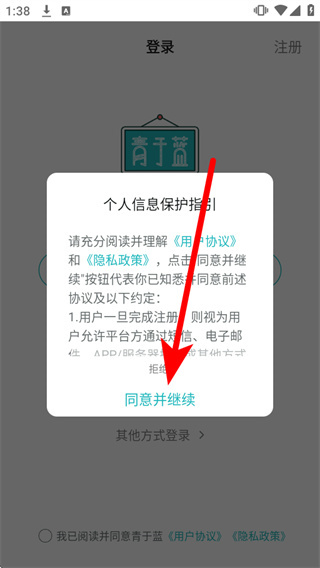 1、打开青于蓝,弹出弹窗后,点击同意并继续,进入登录页面。