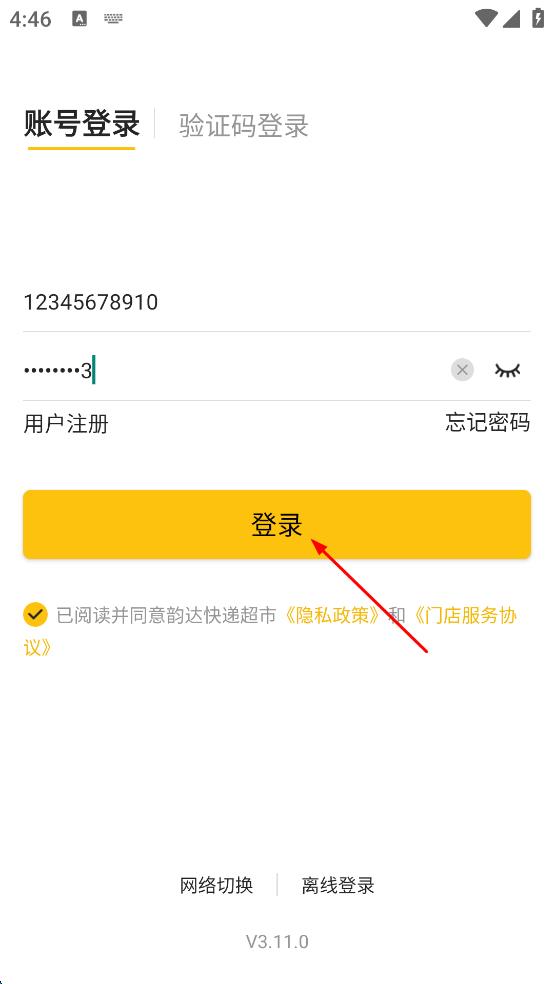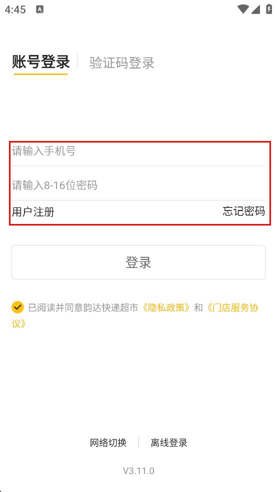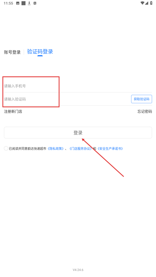 3、在账号登录页面,输入手机号和密码,勾选已阅读并同意隐私政策和门店服务协议。