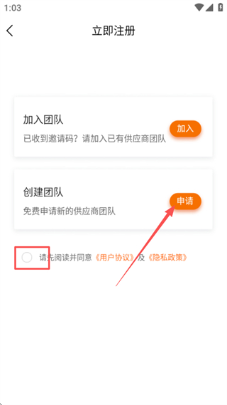 2、在注册页面,勾选协议后点击创建团队的申请按钮,可进入创建团队申请页面。